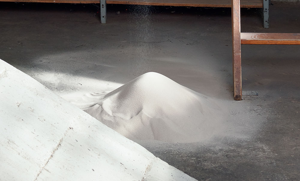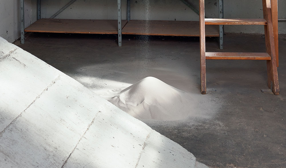- Rauminstallation mit von der Decke rieselndem Sand.