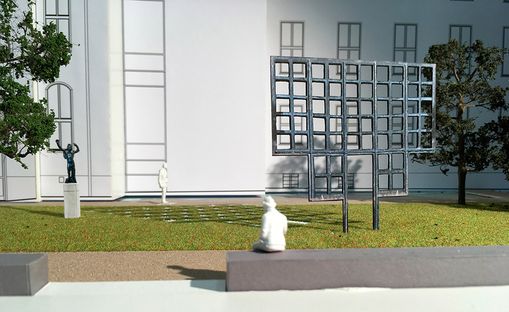 Ausgangspunkt meines Entwurfs ist Schirmers Gemälde von Schadows Garten von 1838 mit dem darauf dargestellten Atelierfenster und der Skulptur des Amors die sich dort einst befand.